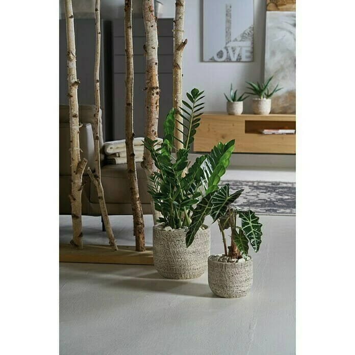 Damit wird der Übertopf dem Interior-Trend zu bodentiefen Fenstern gerecht, mit dem die Nachfrage zu Bodengefäßen einhergeht. Zum Stil von Trend und Topf passen speziell Grünpflanzen, die in der Natur wildwachsend zu finden sind. Z. B. Monstera obliqua und Farne. Eine attraktive Ergänzung zu den Übertöpfen bietet die Portland-Bodenvase – bei einer aufragenden Höhe von 50 cm und 22 cm Durchmesser kommt sie bestückt mit hochgewachsenen Deko-Zweigen besonders gut zur Geltung.