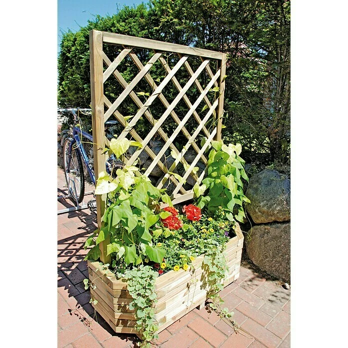 Der T & J Blumenkübel Käthe ist rechteckig mit 4 abgeschrägten Ecken und gefertigt aus Kiefer/Fichte. Die Druckimprägnierung sorgt für die Langlebigkeit des Materials. Ein Foliensatz ist im Lieferumfang enthalten. Die Kanthölzer besitzen die Maße 45 x 45 mm. Lieferung erfolgt ohne Rankgitter.